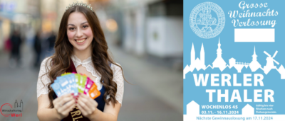 In 4 Ziehungen werden die Gewinnerlose des Werler Thaler Gewinnspiels ermittelt. An dieser Stelle werden bald die ersten Gewinnerlose bekanntgegeben. Weiterhin teilen wir die Gewinnerlose über unsere Social Media Kanäle und sie erscheinen im Soester Anzeiger.